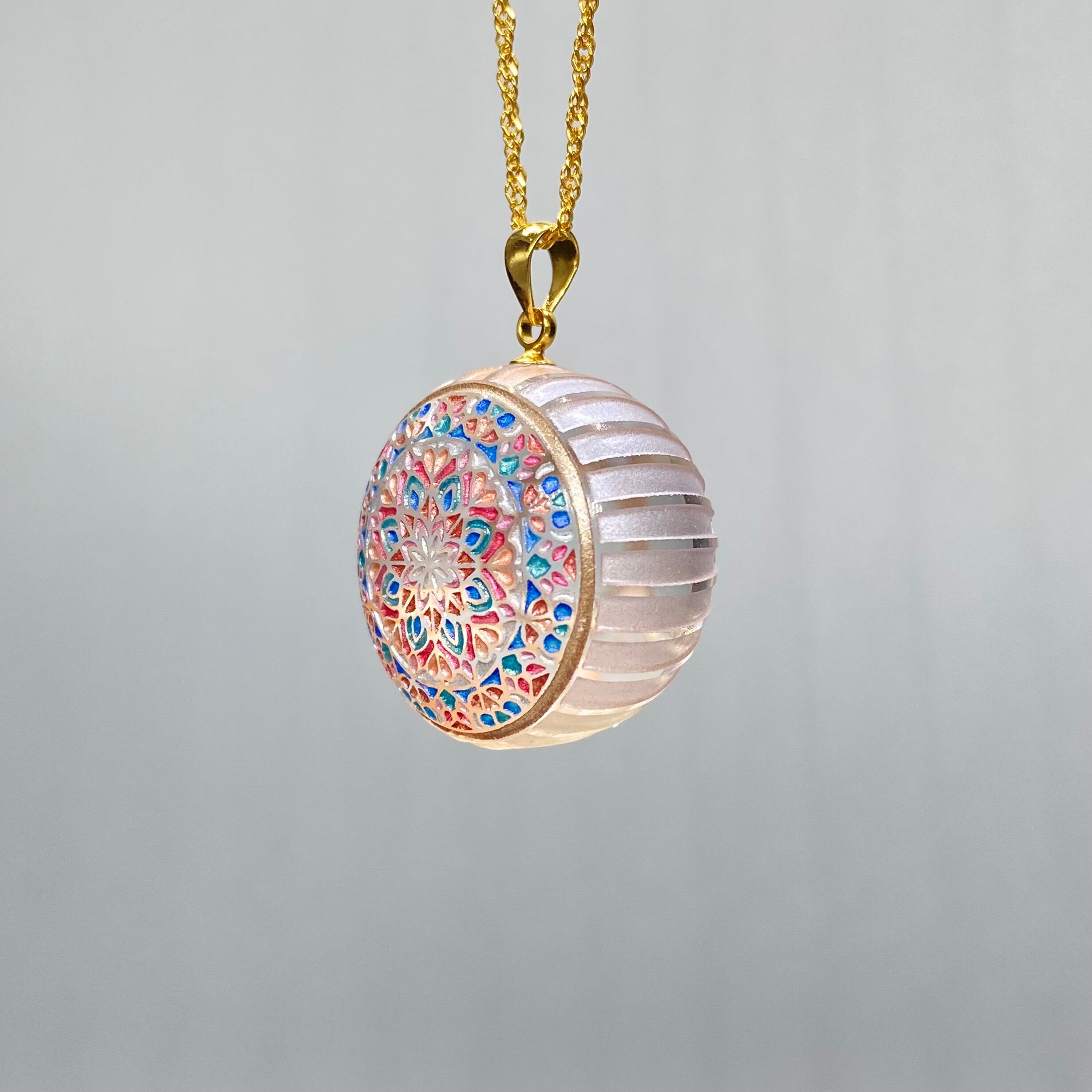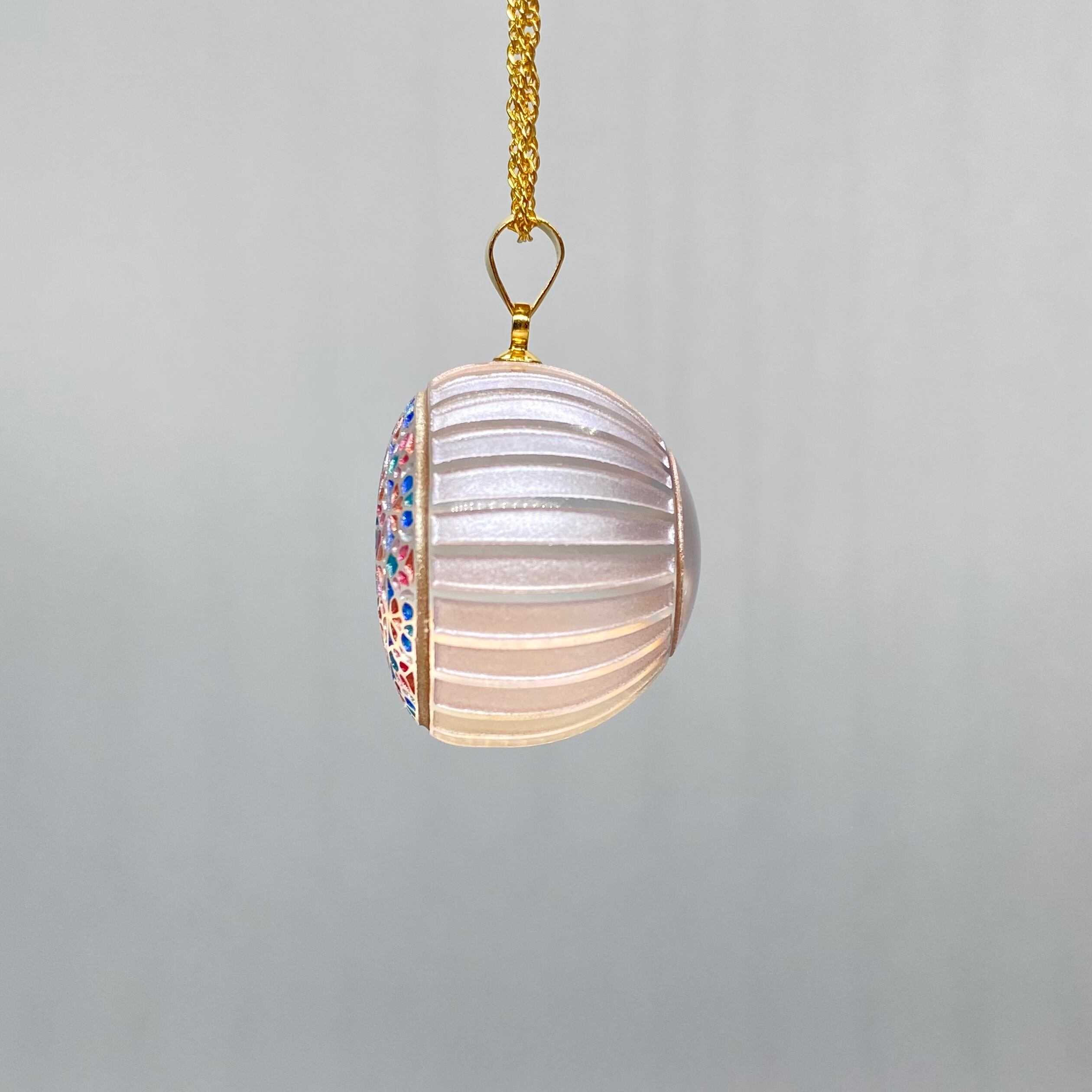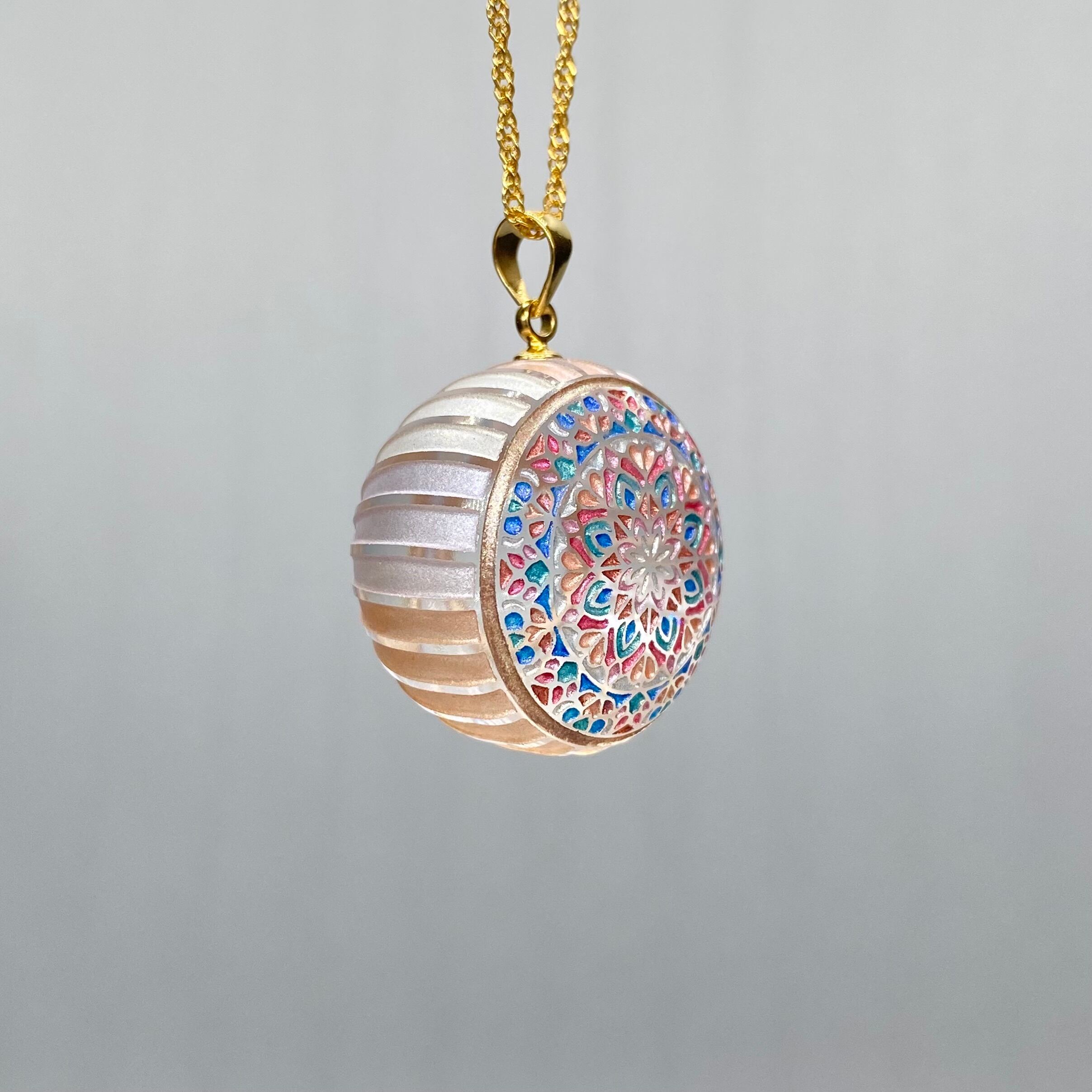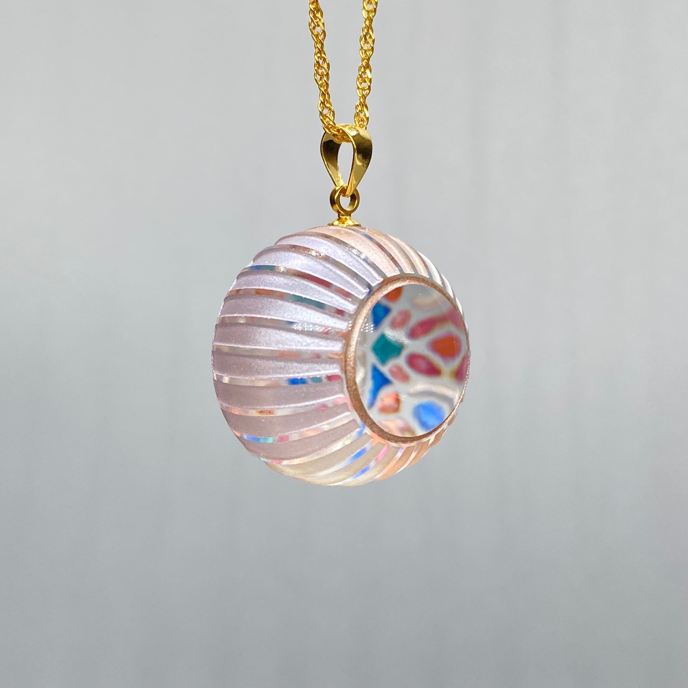 万華鏡ペンダント 《朝露》 草花についた朝露が朝日を浴びて周りの景色の色を映し出す様子をイメージした作品です。 隙間から見える色と模様が様々な表情を見せてくれます。 直径2.2センチ 厚さ1.9センチ ※手作りのため個体差がございます ※ペンダントトップのみの販売です